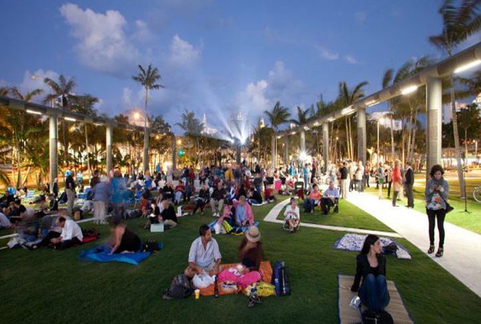 3-acre urban park adjacent to the Frank Gehry-designed New World Center (symphony hall). The park supports a multitude of day and night uses and includes a state-of-the-art sound and projection system, which projects live concerts and other artistic programming on to the 7,000 SF wall of the symphony hall. The sound system and lighting are housed in “Ballet Bars”, which also define the amphitheater space, in speaker “hydrants”, and in the stem of the projection tower. The park is complemented by a mosaic of white concrete sidewalks, undulating seating walls, and iconic aluminum pergolas (sculptural abstractions of cumulus clouds rising to a height of up to 22.5 feet) supporting flowering bougainvillea vines.