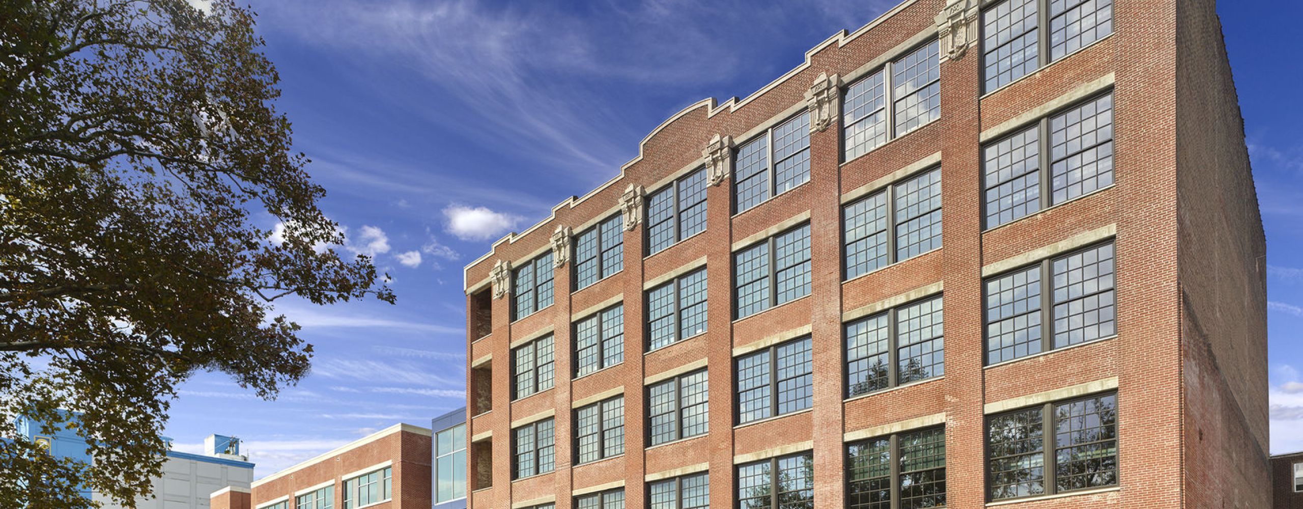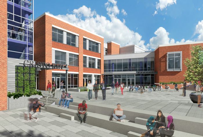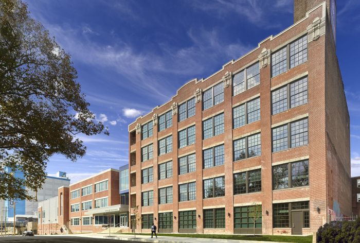 Cristo Rey Philadelphia High School is a college preparatory, Catholic school for students of all faiths which offers an innovative work-study model where each student works at a company in the Greater Philadelphia Area one day per week. This 5-acre high school campus project included the renovation and adaptive reuse of the historic A. Mecky Tricycle Factory, a 5-story, 55,000 SF heavy timber and masonry warehouse building. A new, 48,000 SF steel-framed addition rounds out the campus. The addition houses school program spaces, administrative offices, and a gymnasium/ health center, while outside, the campus features a new turf soccer field, parking, and outdoor instructional and gathering spaces.