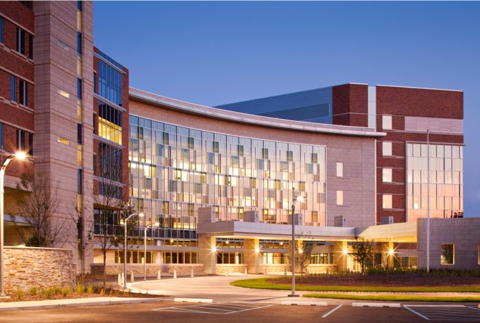 The 905,000 SF, steel-framed, LEED Gold certified medical campus is comprised of a 6-story, 575,000 SF replacement hospital and two attached medical office buildings totaling 330,000 SF. The hospital design includes 320 single-occupant patient rooms and 4 Med/Surg floors. The imaging and radiology departments were designed to support increased loads from two linear accelerator vaults, a Cyberknife vault, and MRI and Cath labs. A dedicated central utility plant was constructed onsite to handle the major mechanical equipment. Behind the hospital’s sweeping contemporary exterior is a 4-story open atrium.