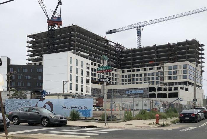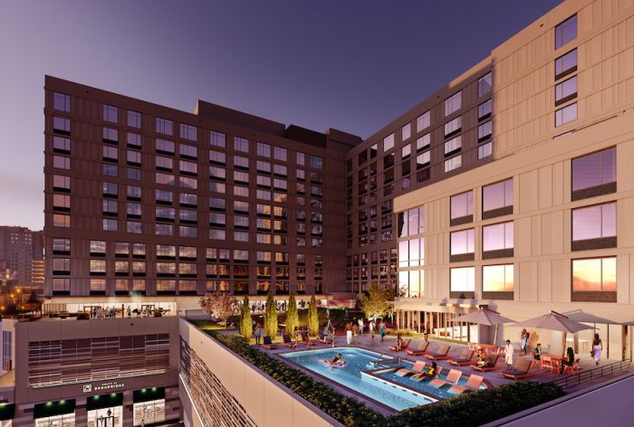 The 4th level podium serves both as the outdoor rooftop amenities spaces, comprised of precast concrete double tees, while the interior spaces are supported by precast plank and deep steel WF transfer beams for the shifted column grids in the residential micro-unit tower above.